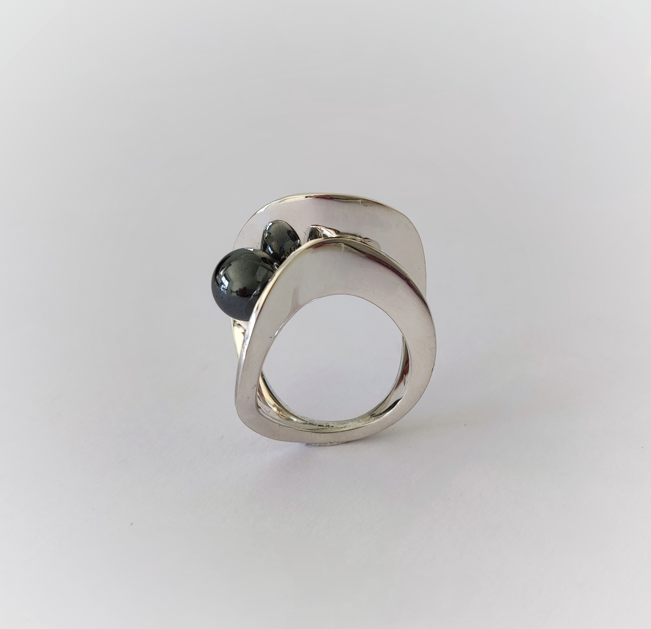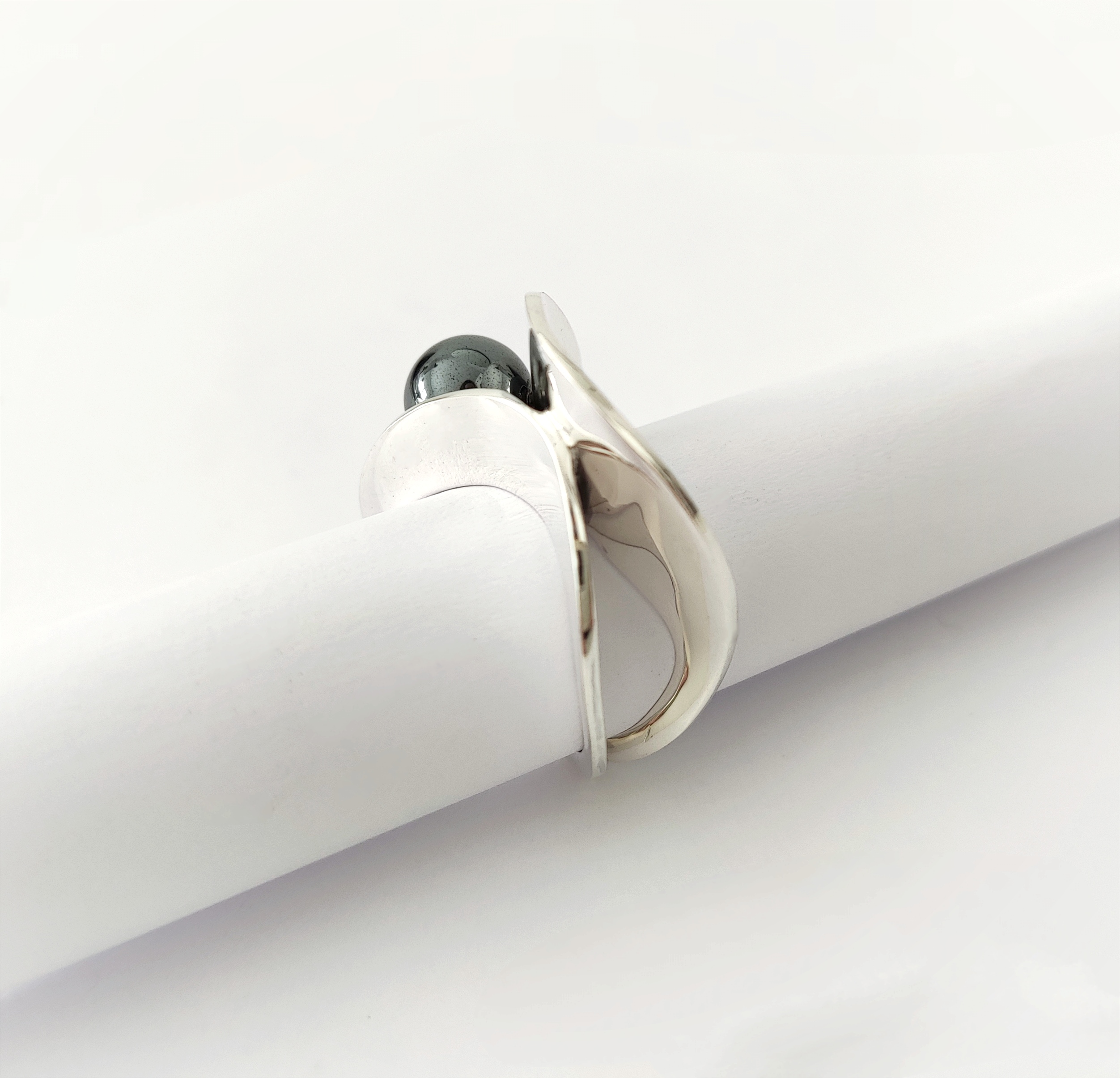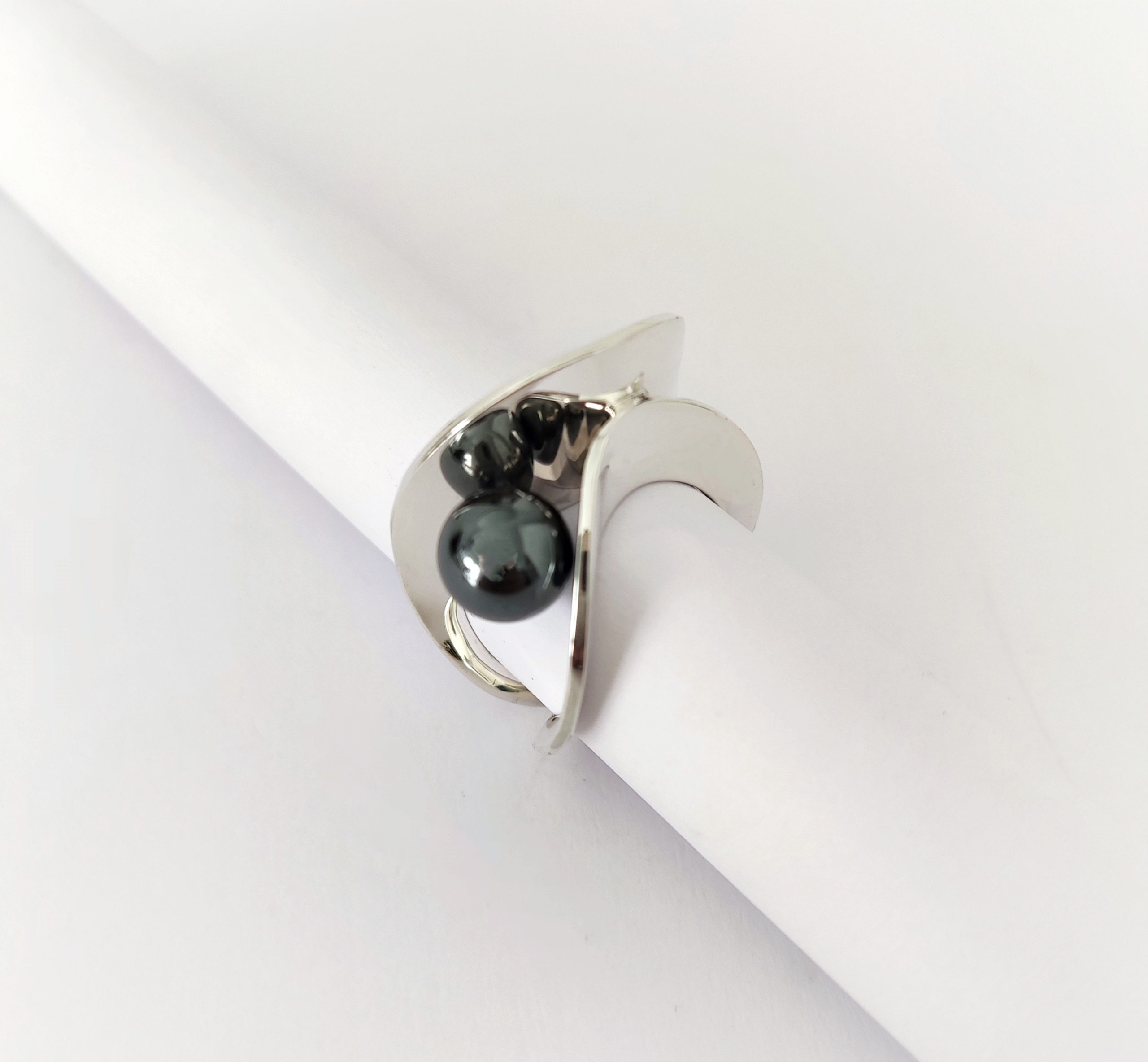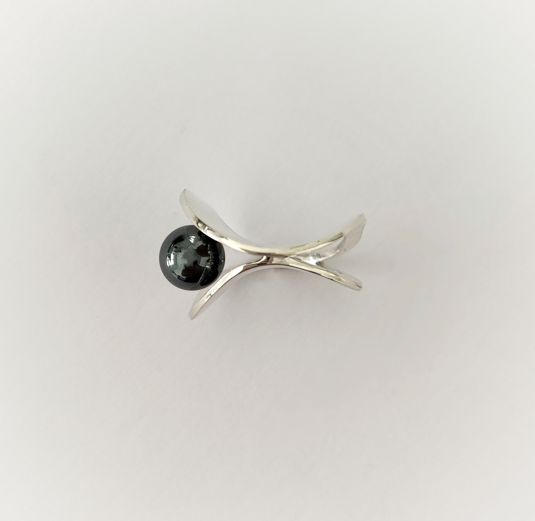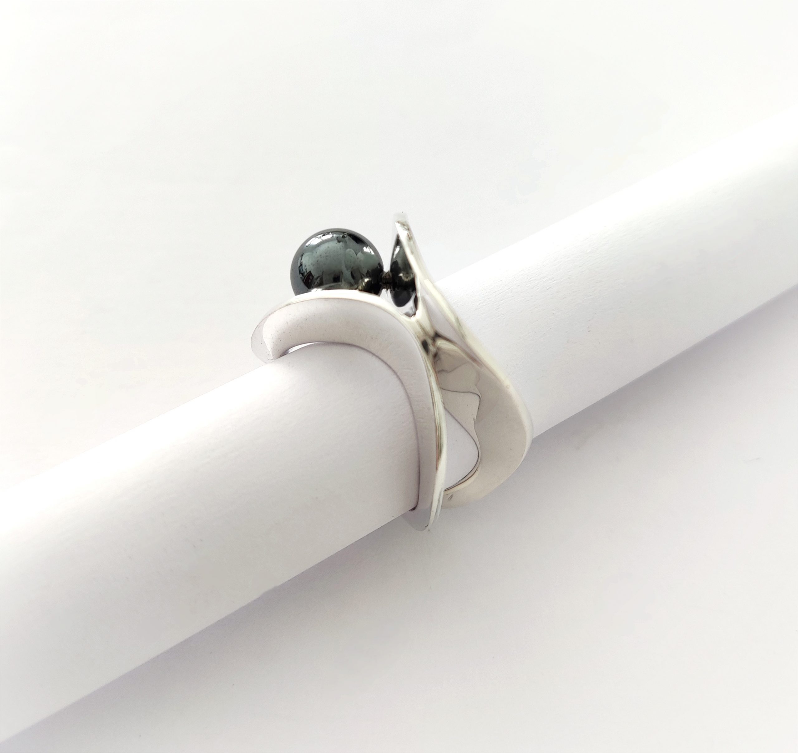 Pendientes de plata de primera ley o 925 milésimas, con acabado pulido efecto espejo y bola de hematite de 8 milímetros de diámetro. Cierre de tuerca de presión.
