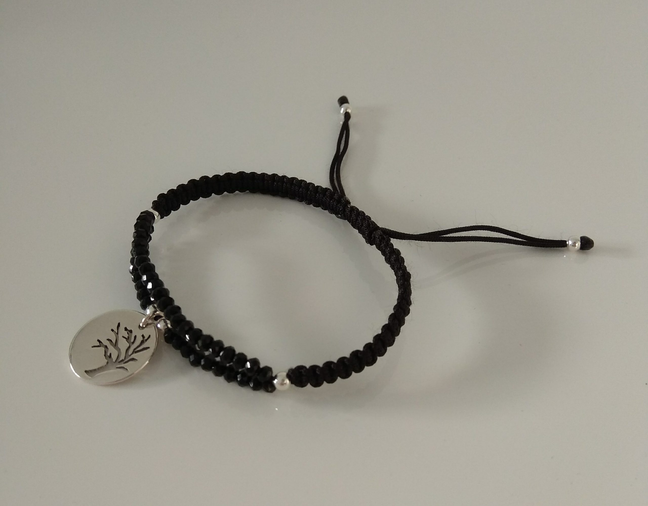 Pulsera de macramé tejida en nylon con cristales negros y colgante de plata de 925 milésimas con acabado pulido efecto espejo.