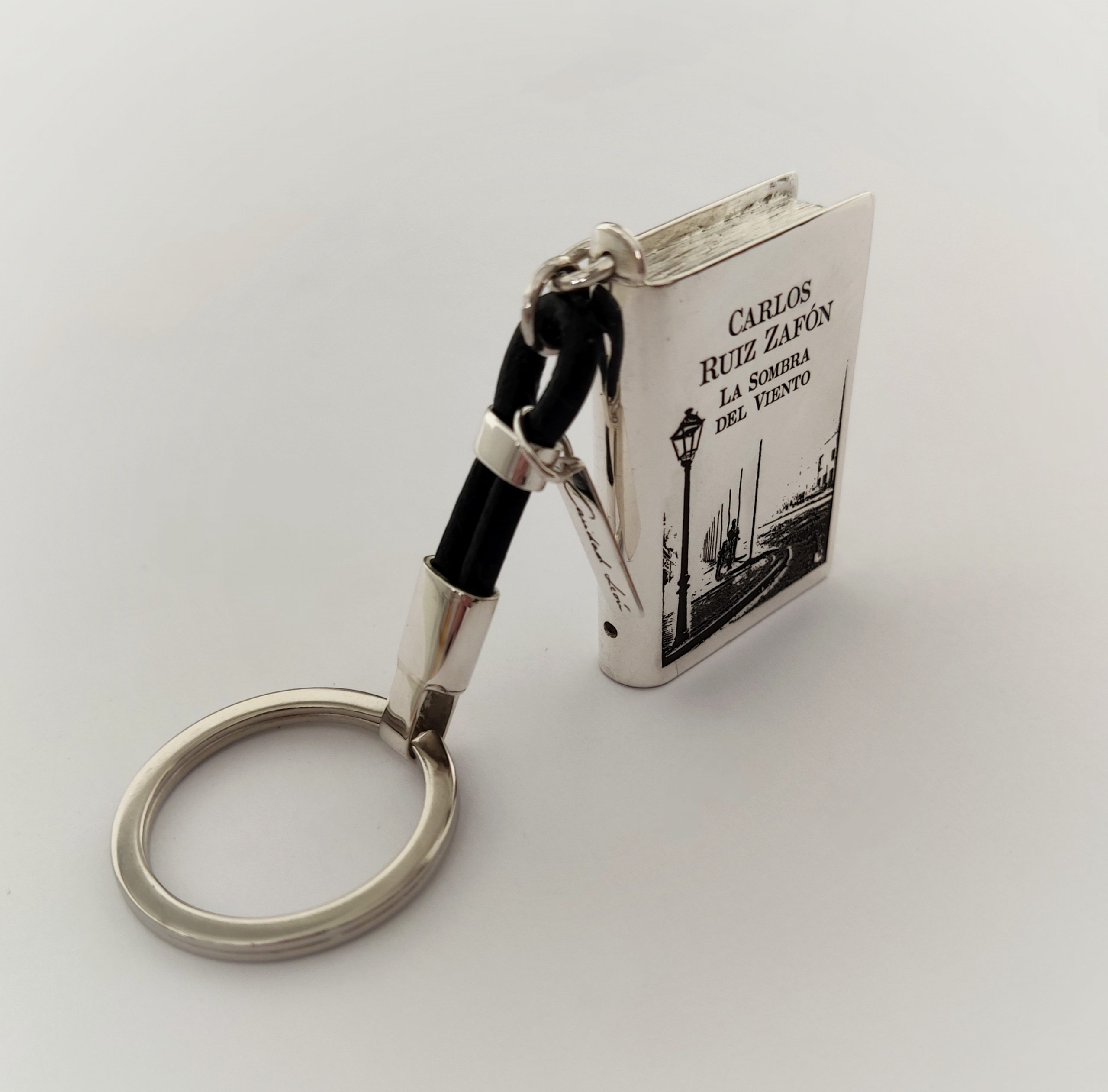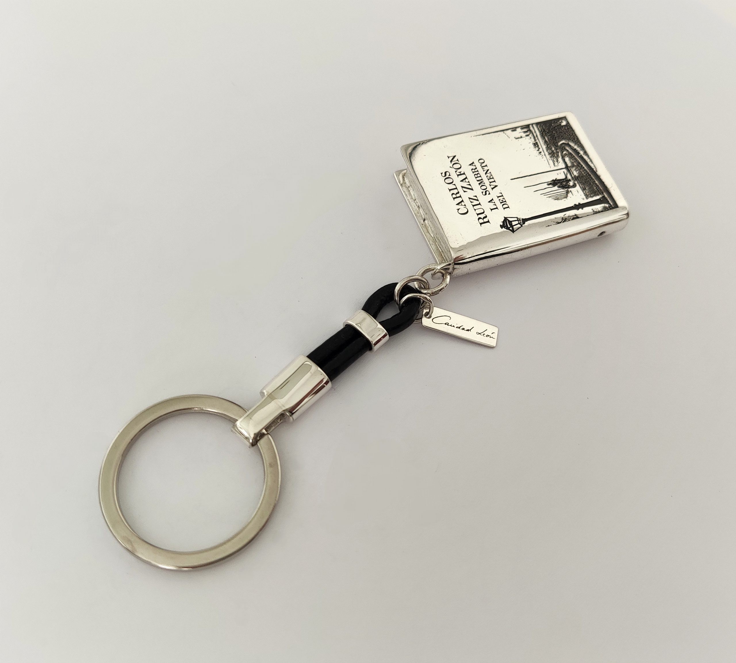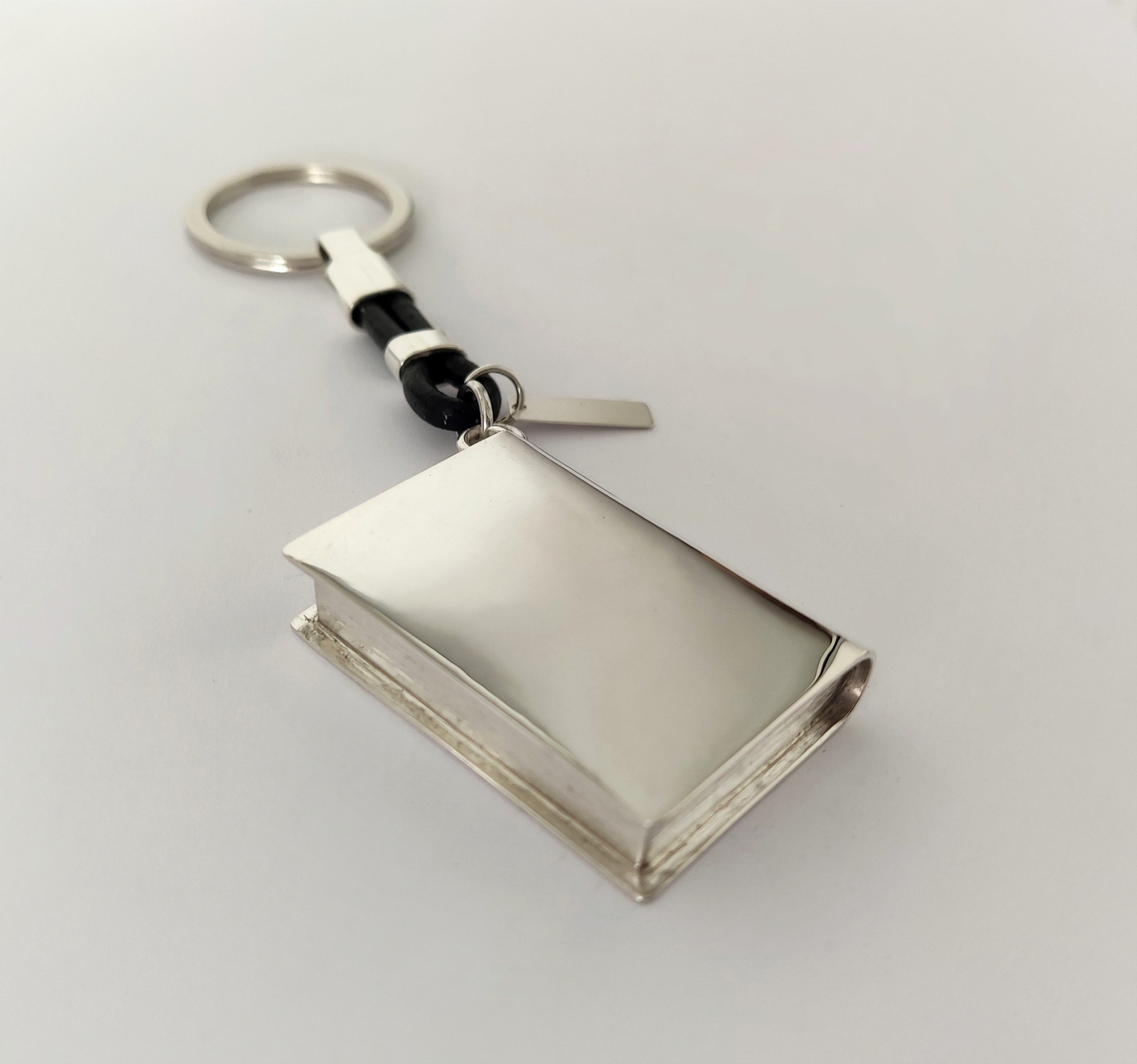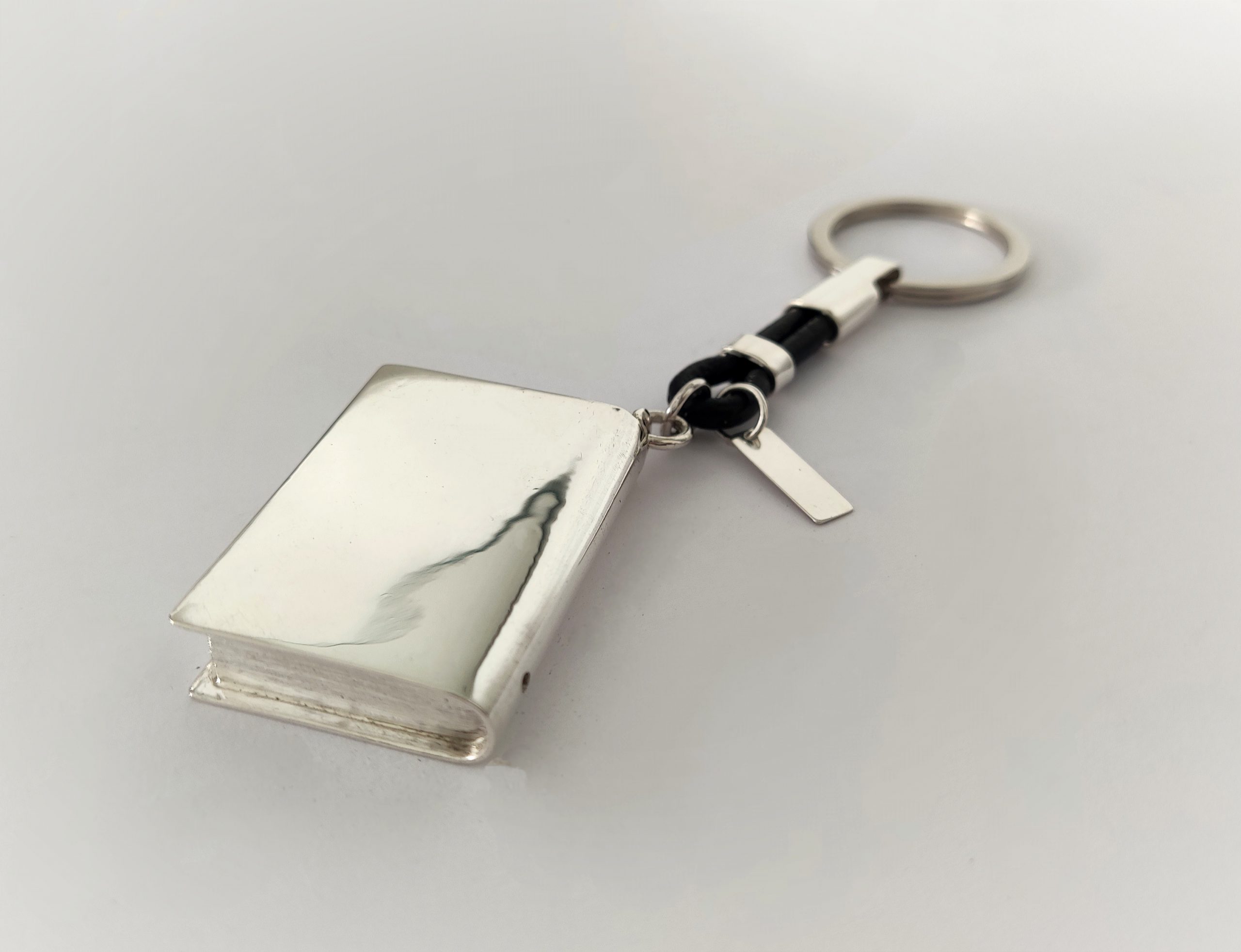Llavero de plata de 925 milésimas , con acabado pulido efecto espejo, rayado y óxido. Anilla de acero.