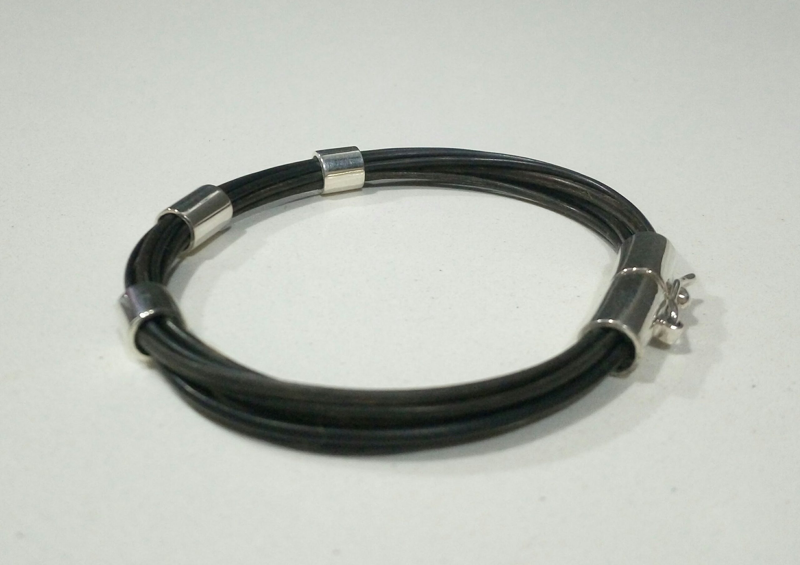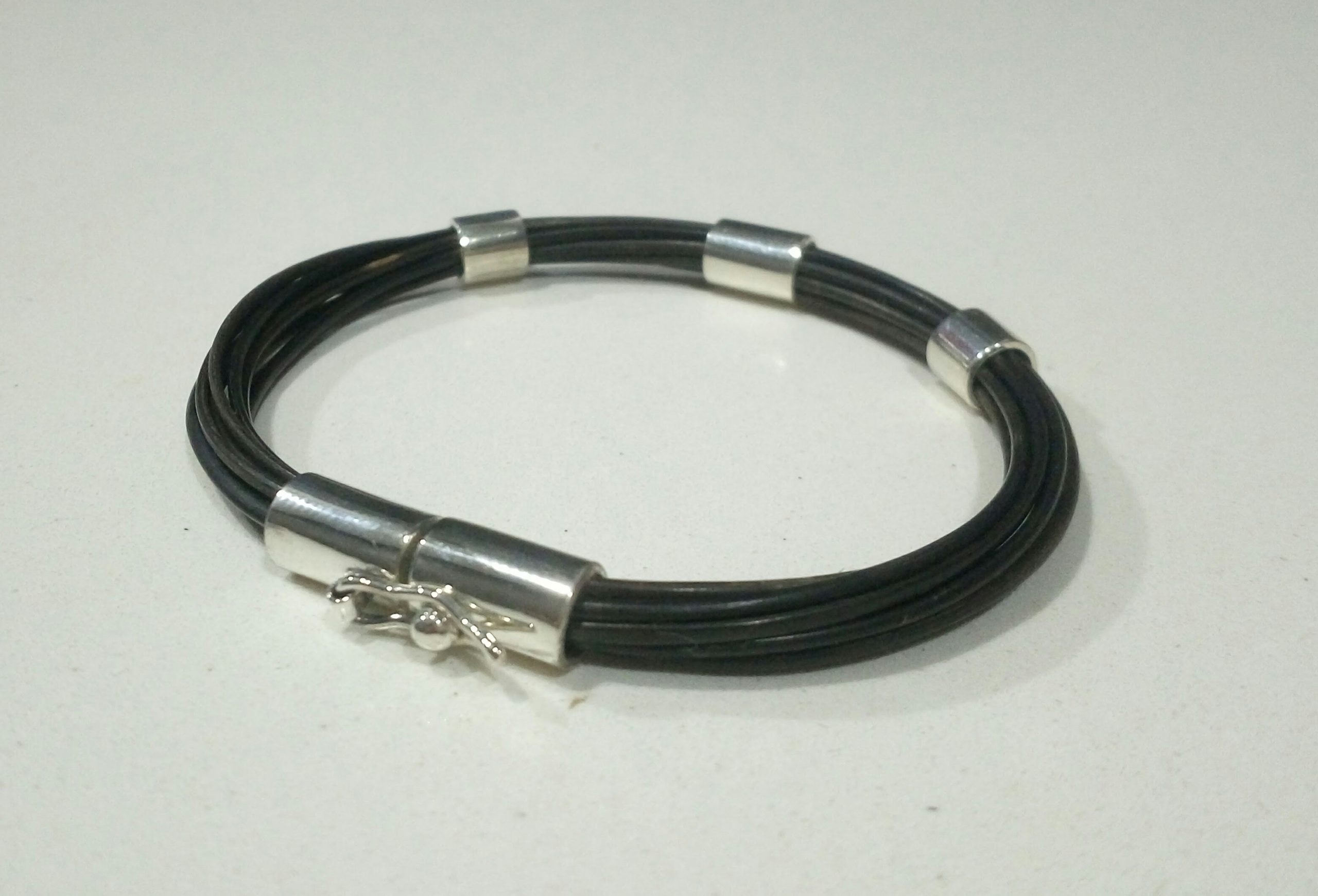 Pulsera de plata de 925 milésimas con acabado pulido efecto espejo e hilos de cuero marrón.