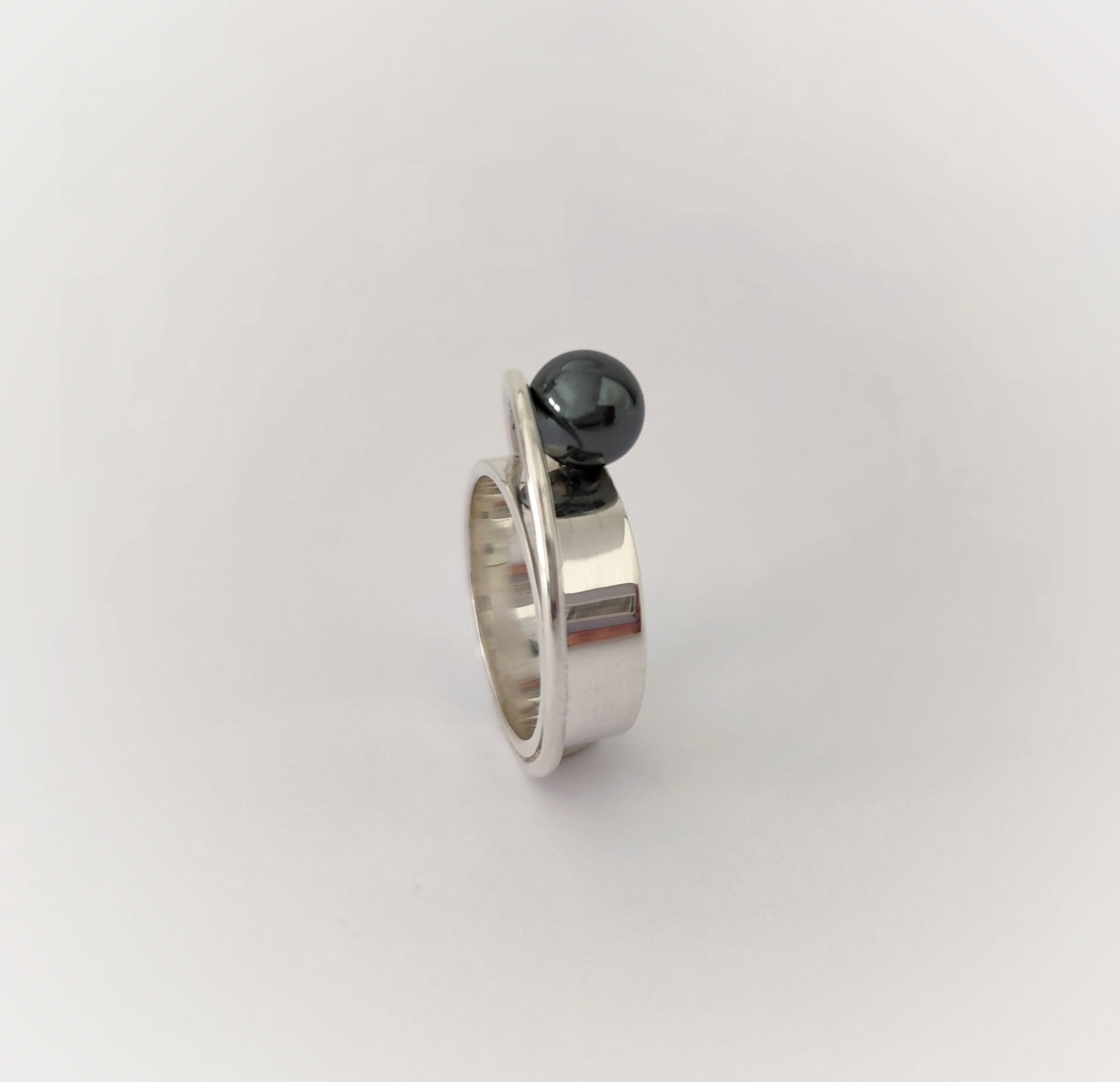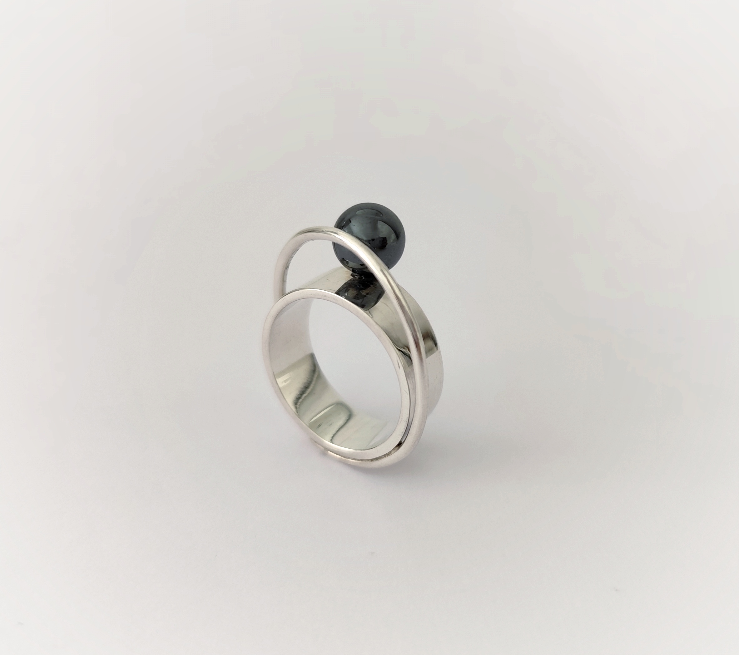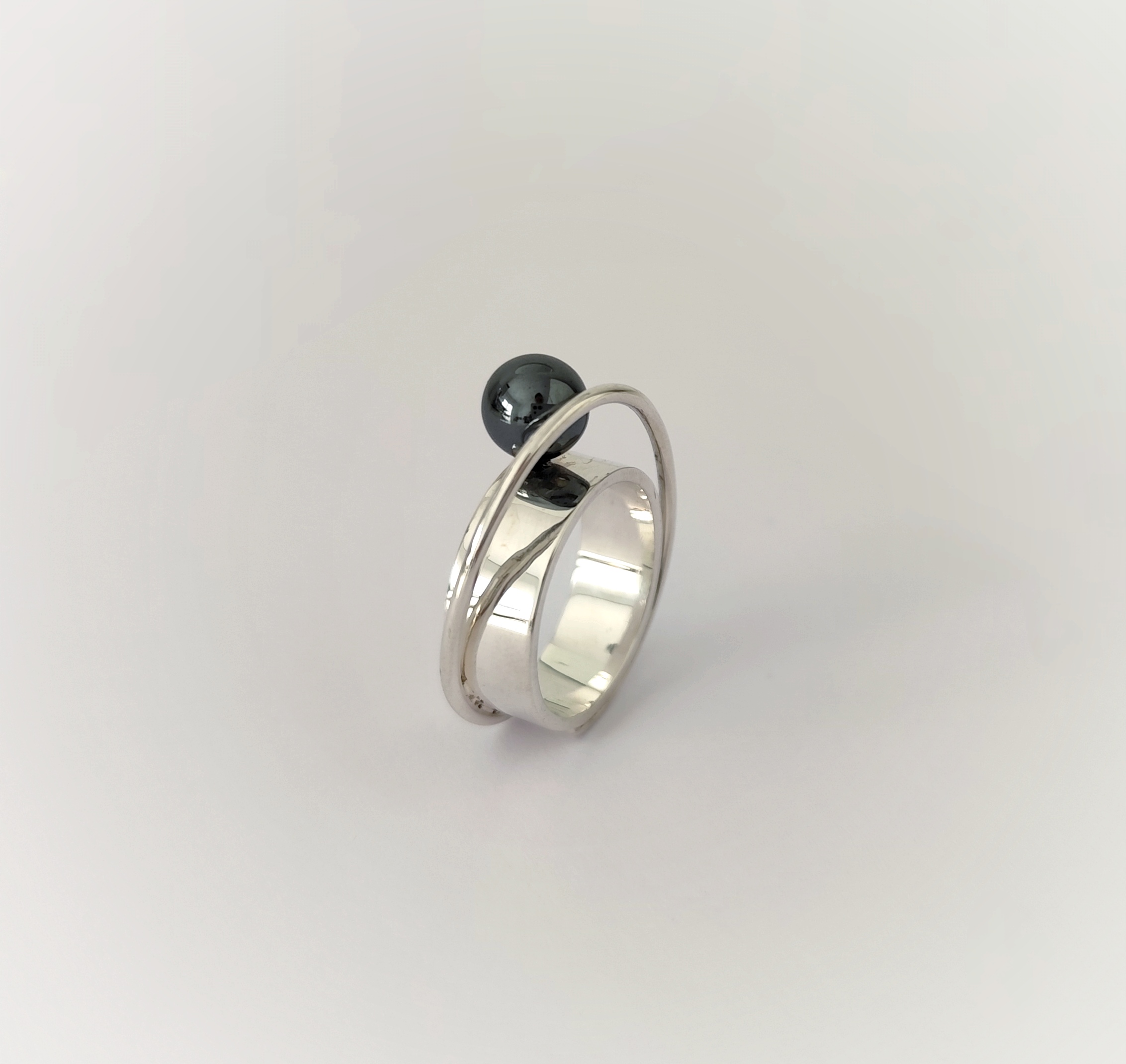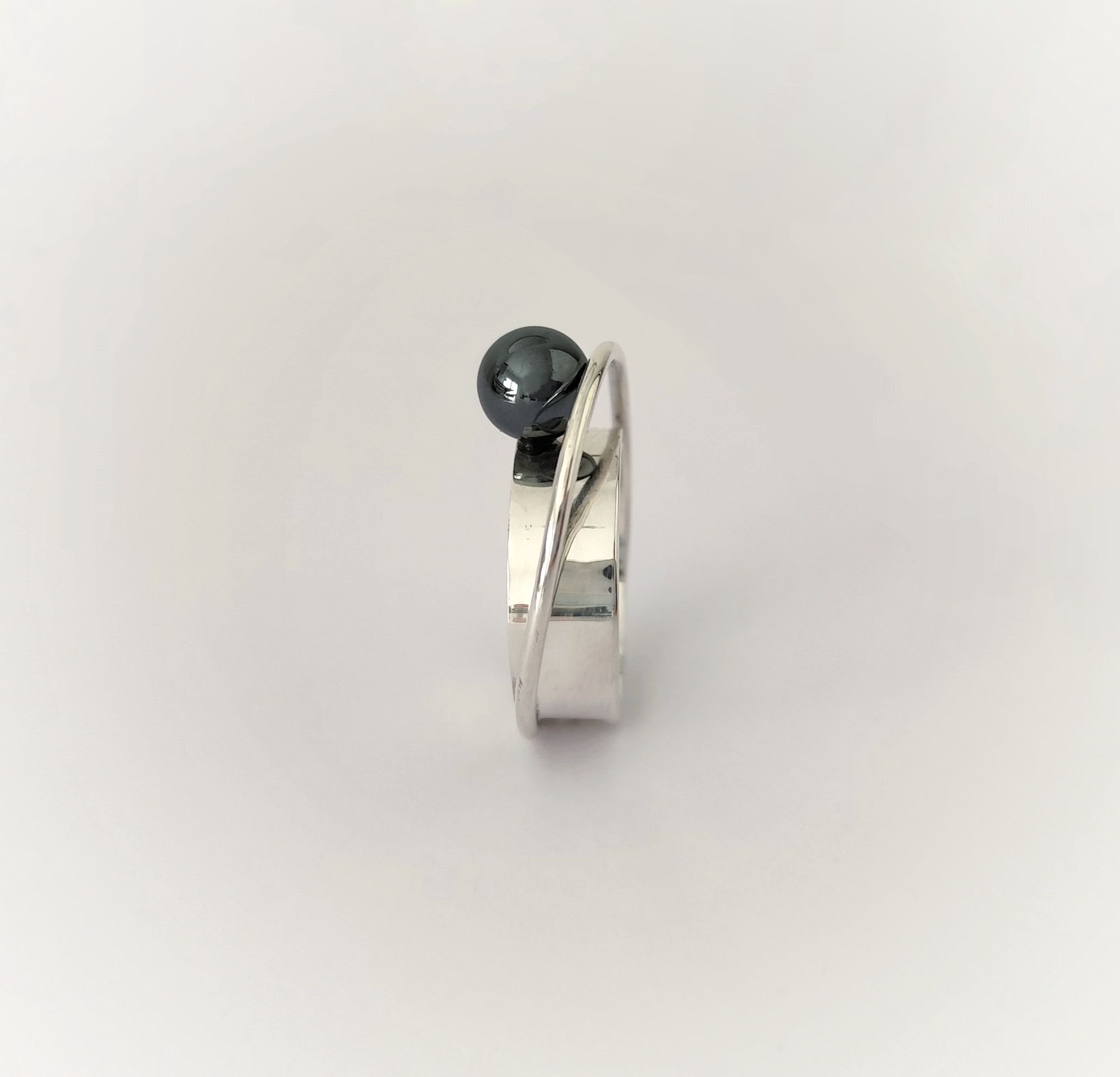 Anillo de plata de primera ley o 925 milésimas, con acabado pulido efecto espejo y bola de hematite.