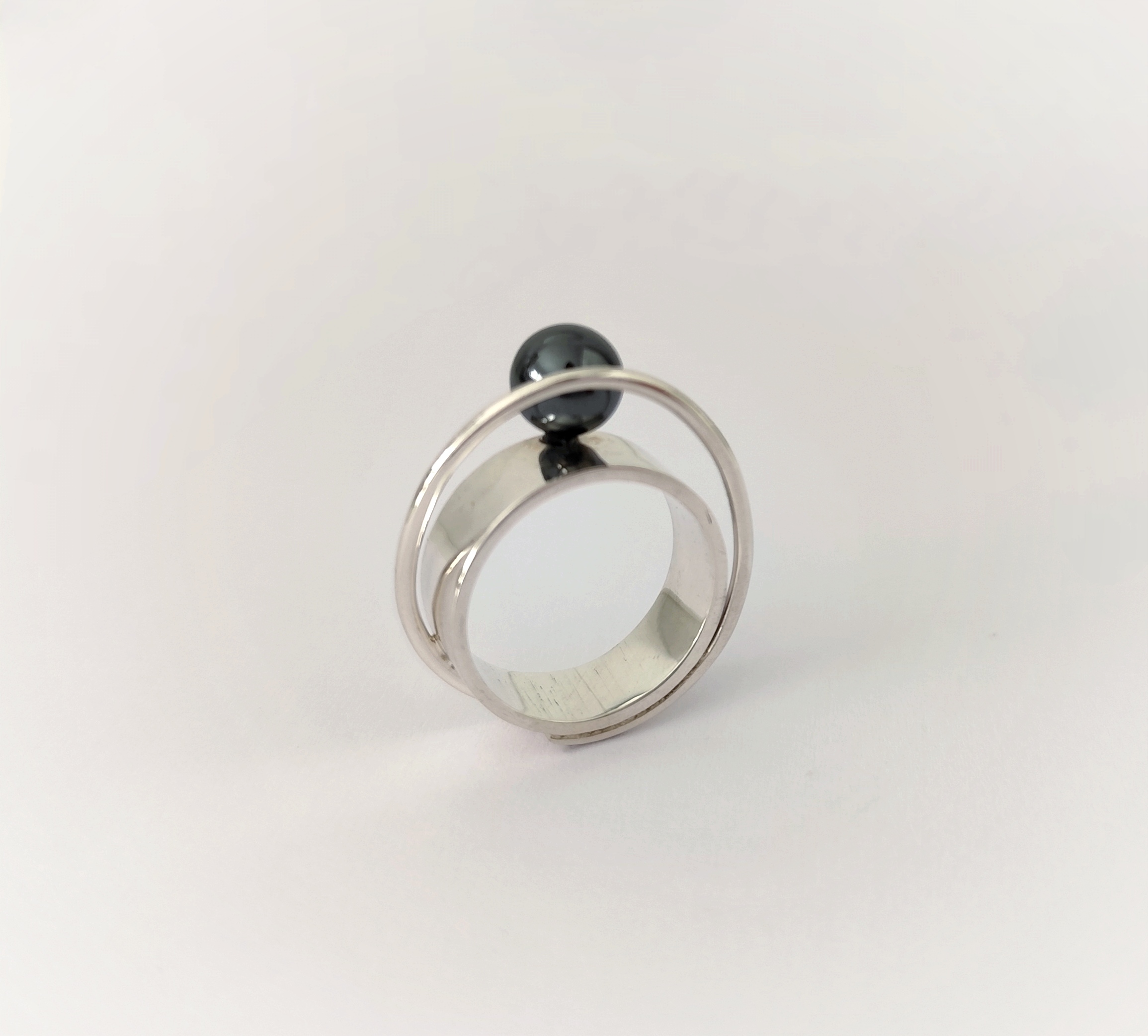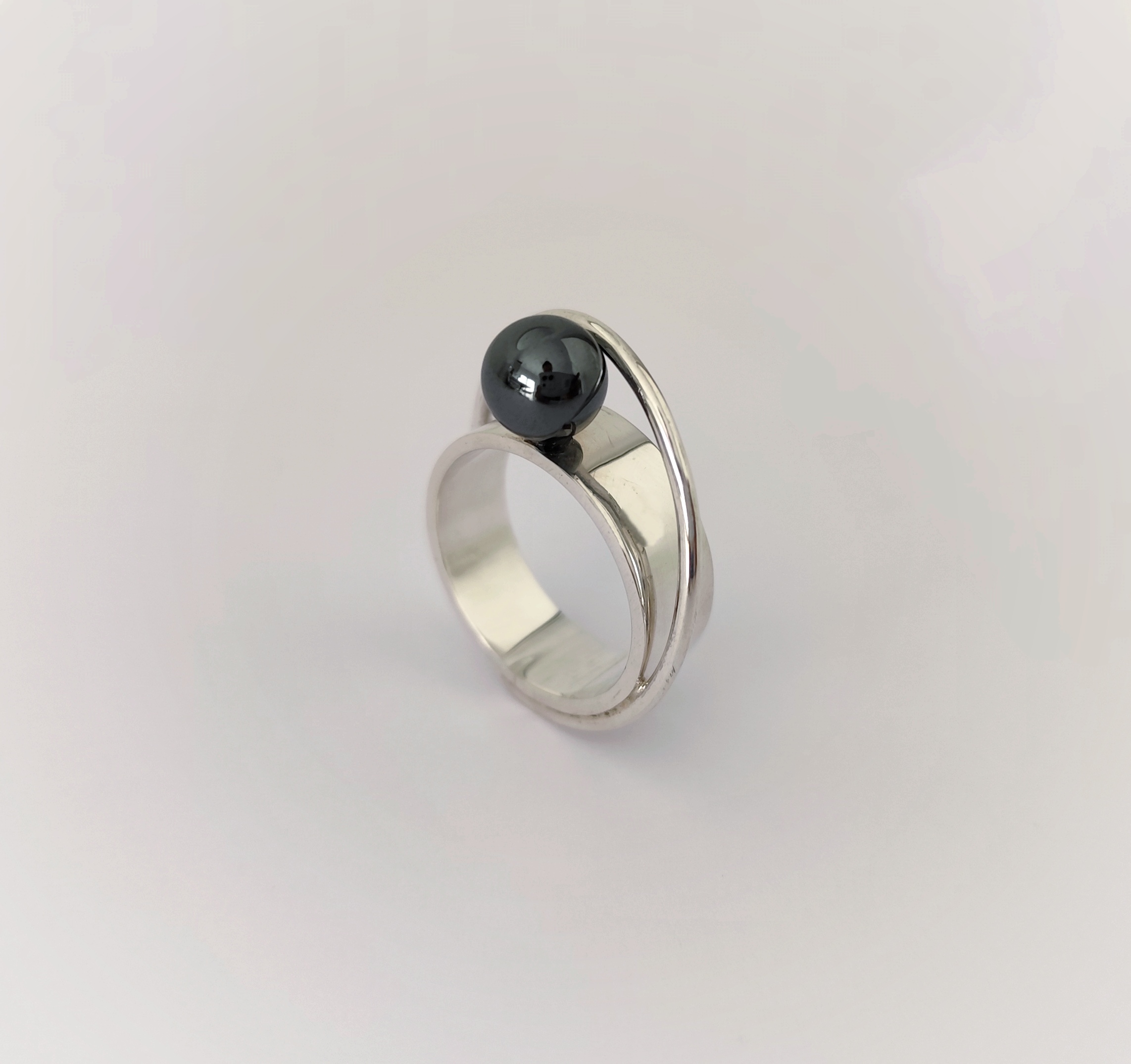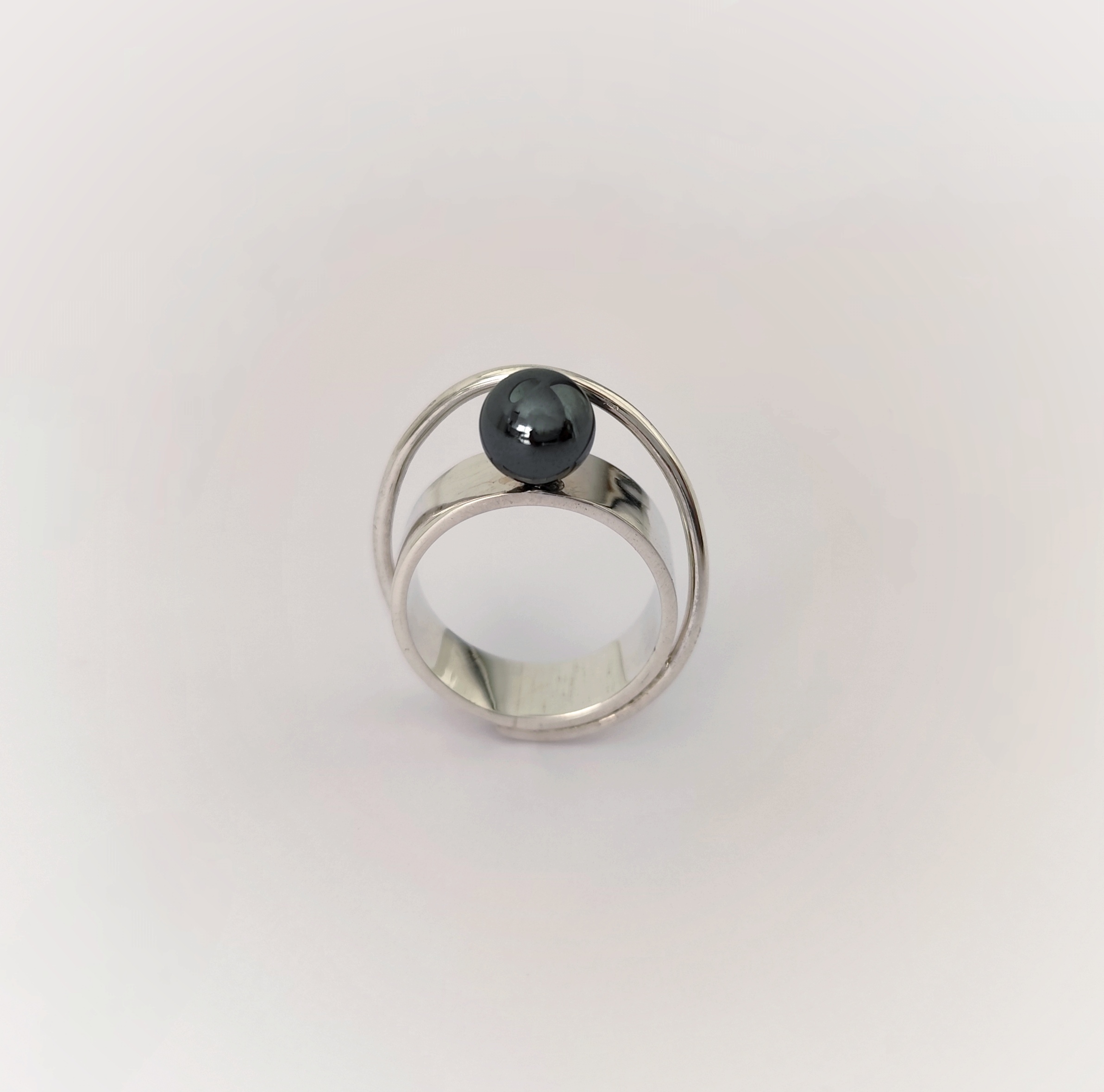 Anillo de plata de primera ley o 925 milésimas, con acabado pulido efecto espejo y bola de hematite.