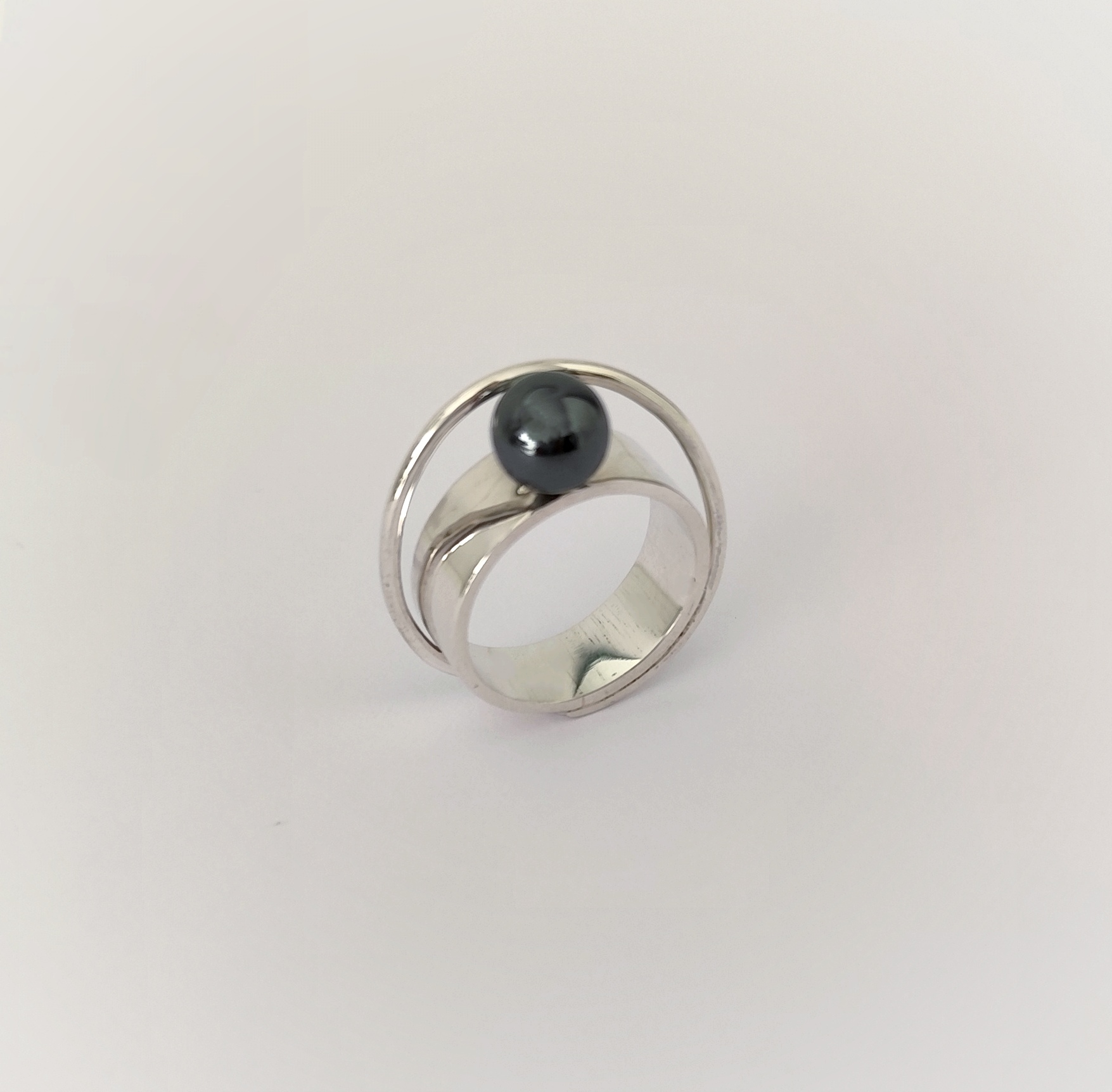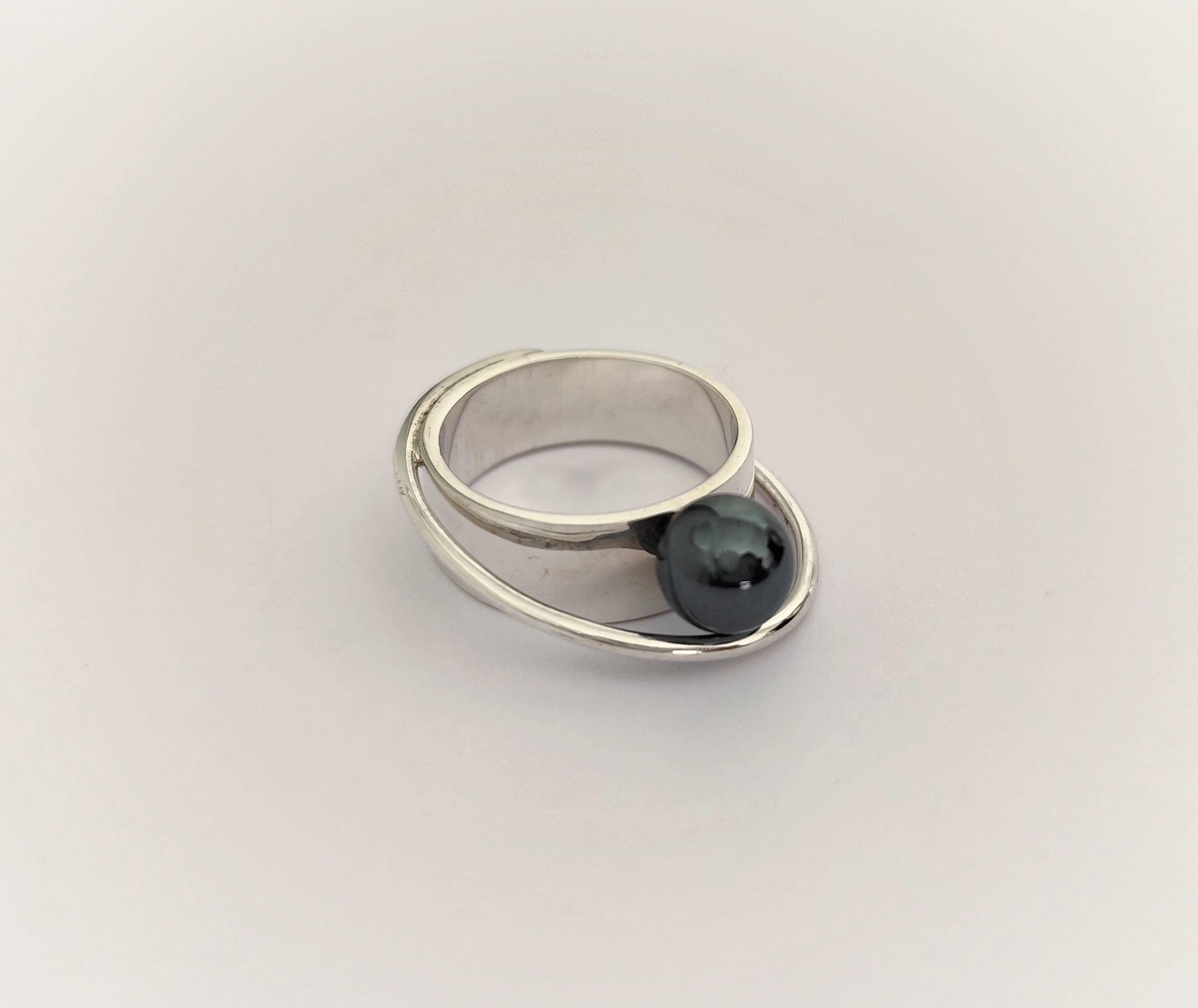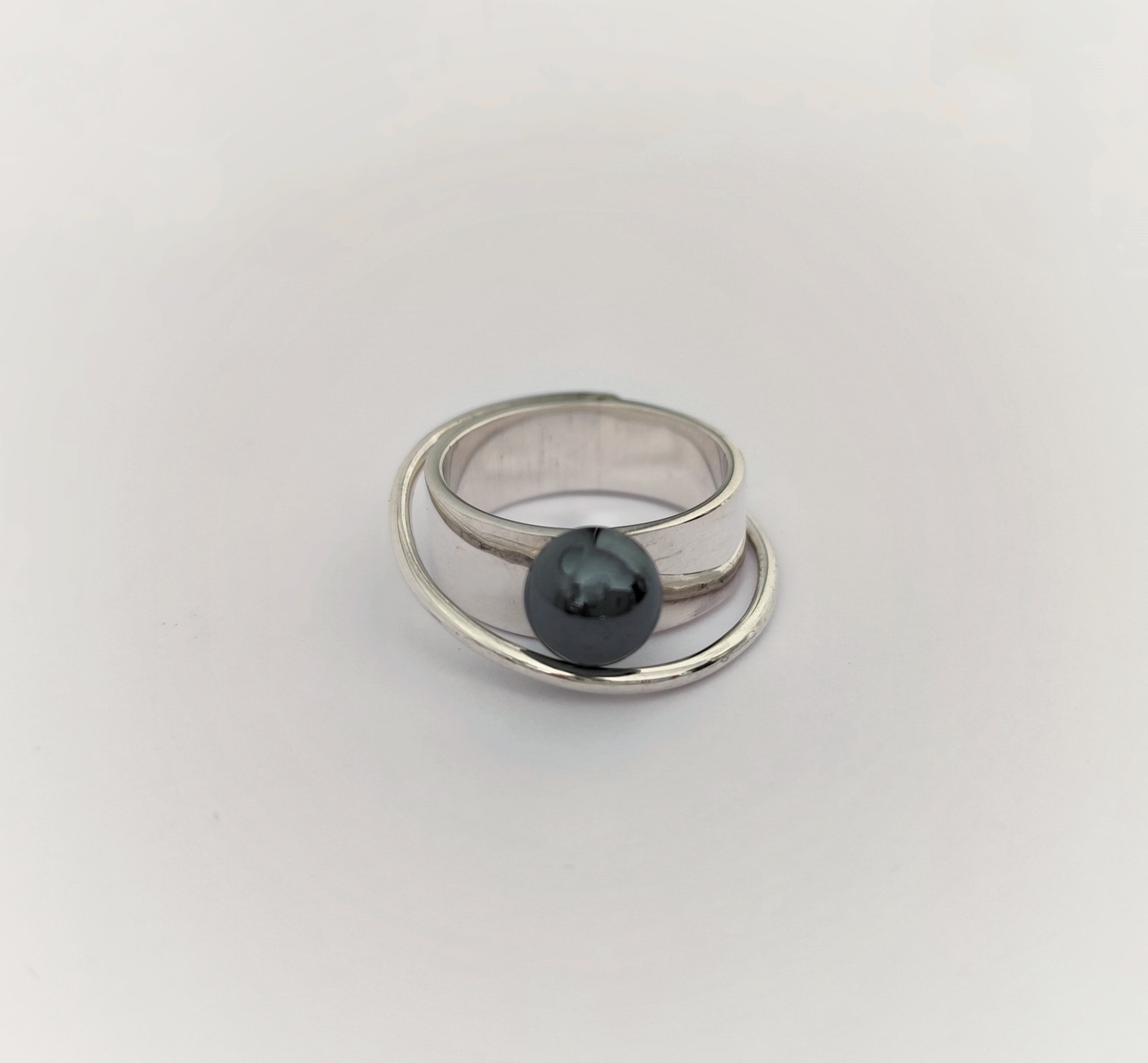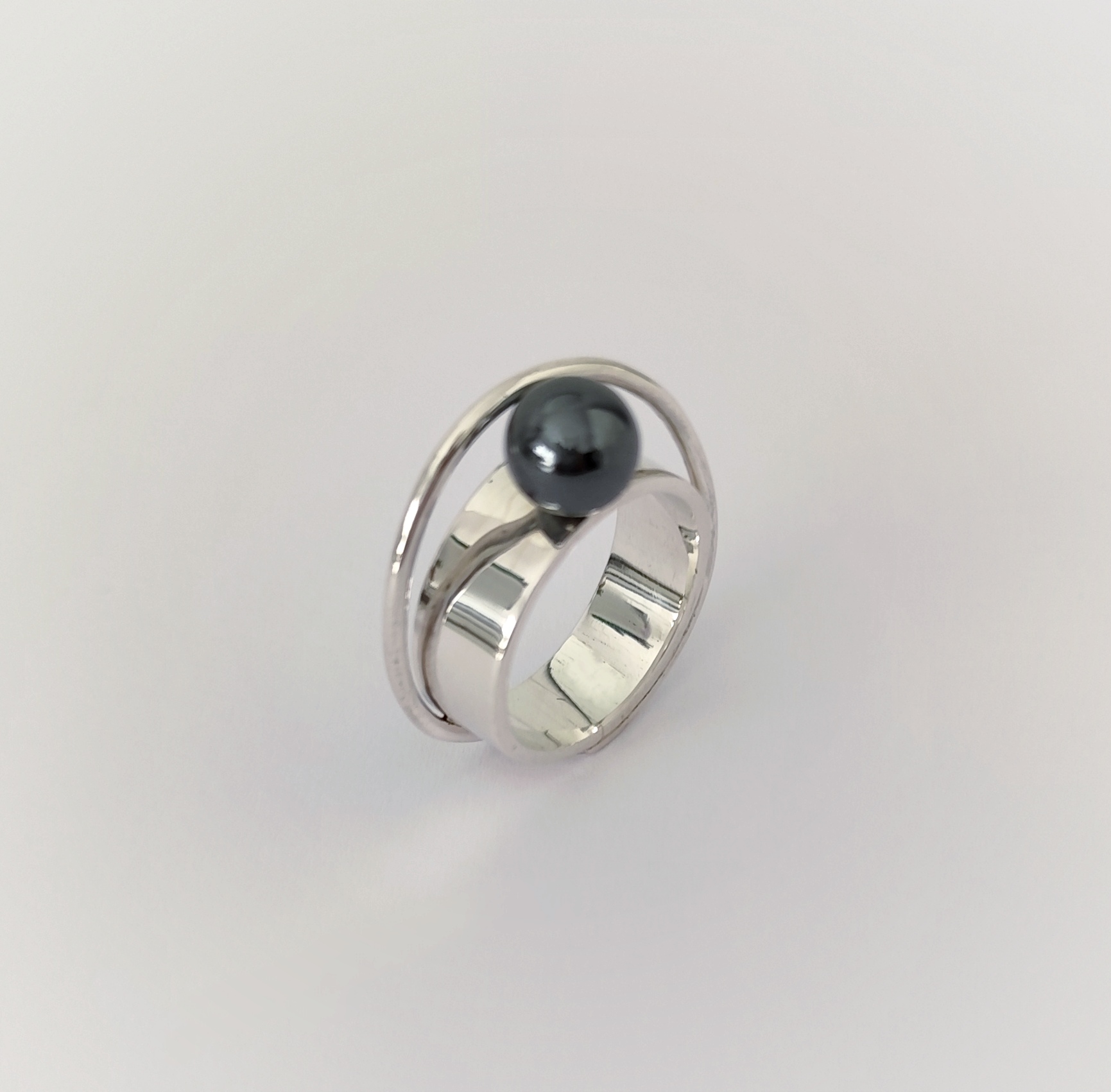 Anillo de plata de primera ley o 925 milésimas, con acabado pulido efecto espejo y bola de hematite.