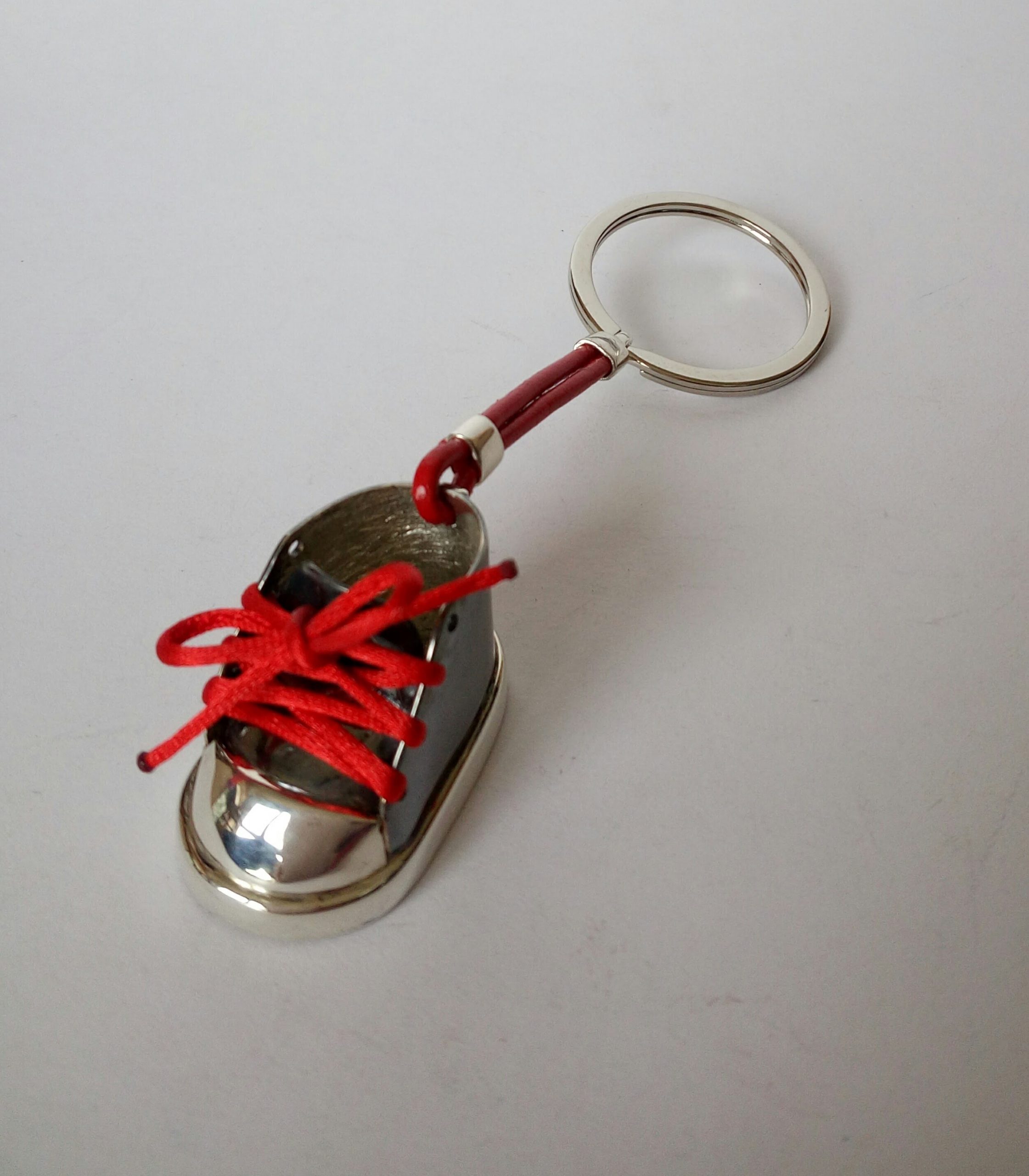 Llavero de zapatilla ( tipo converse) con acabado pulido efecto espejo, oxido y mate con anilla de acero y cuero de sección circular rojo.