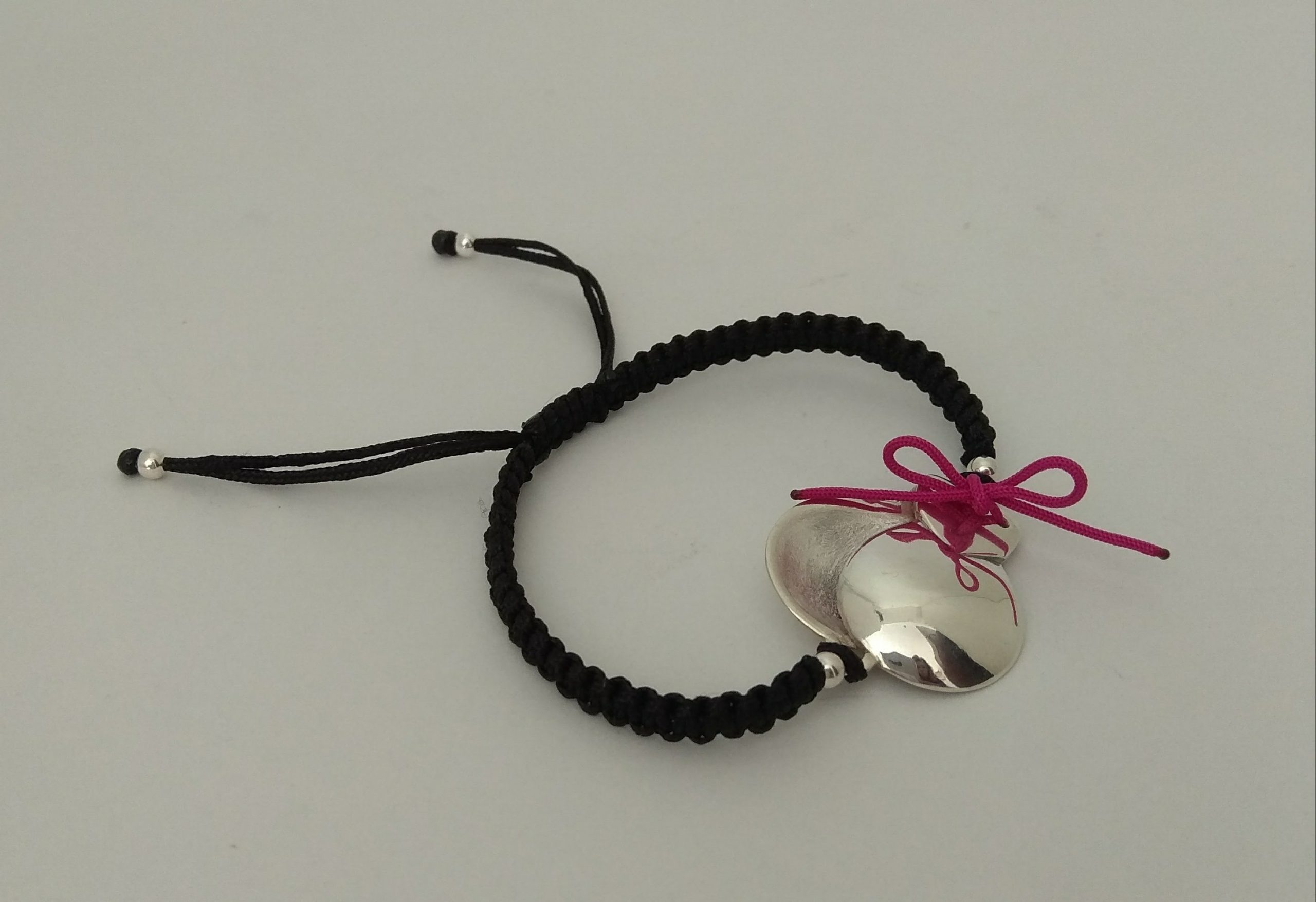 Pulsera tejida con hilo de nylon y plata de 925 milésimas con acabado pulido efecto espejo.